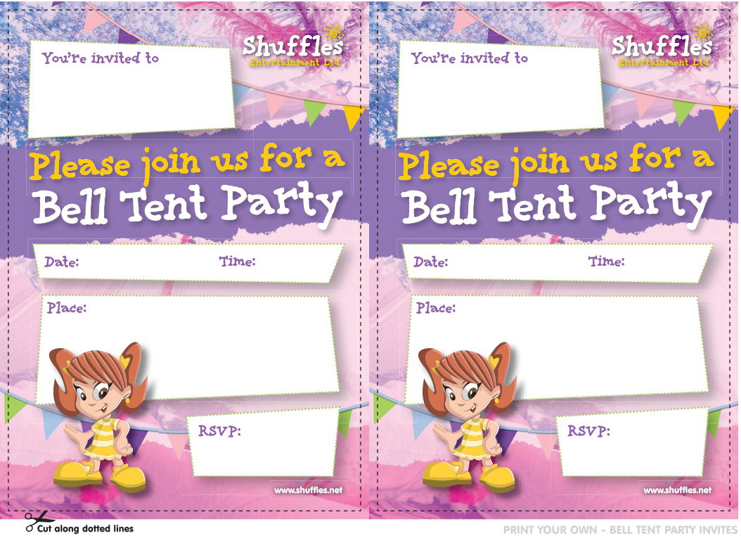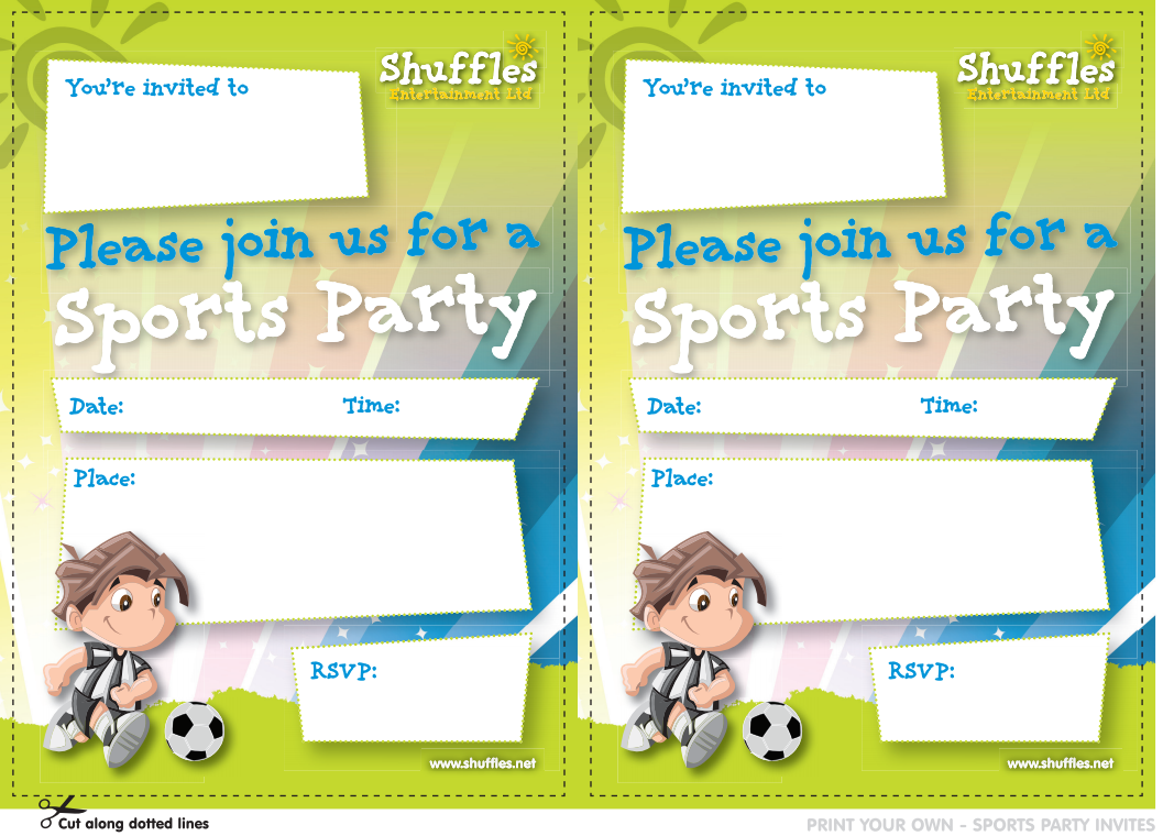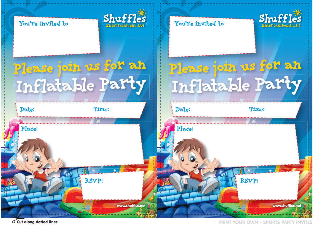 Here you will find fantastic birthday party invitations you can use for free home printing with links to the invitation download below. These are suitable for general birthday parties, sports themed parties, inflatable parties and bell tent parties.